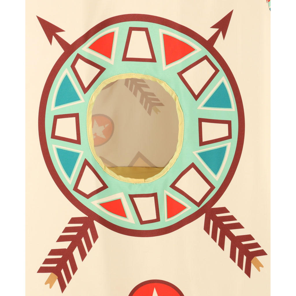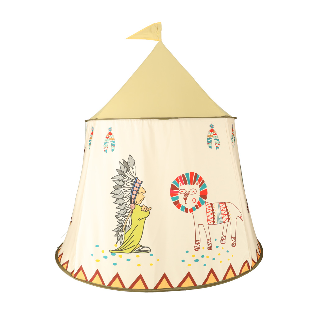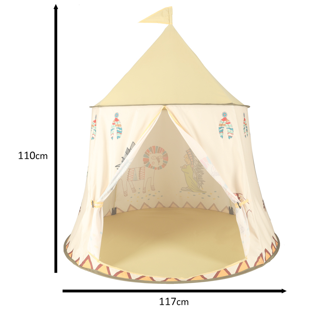 Dziecięcy, składany namiot w stylu wigwam wykonany z trwałego materiału. Ozdobiony indiańskimi rysunkami i wizerunkami Indian. Dodatek do pokoju dziecięcego. Zapakowany w praktyczny futerał. Wymiary: śr. dołu: 117cm, śr. góry: 85cm, wys. 110cm.