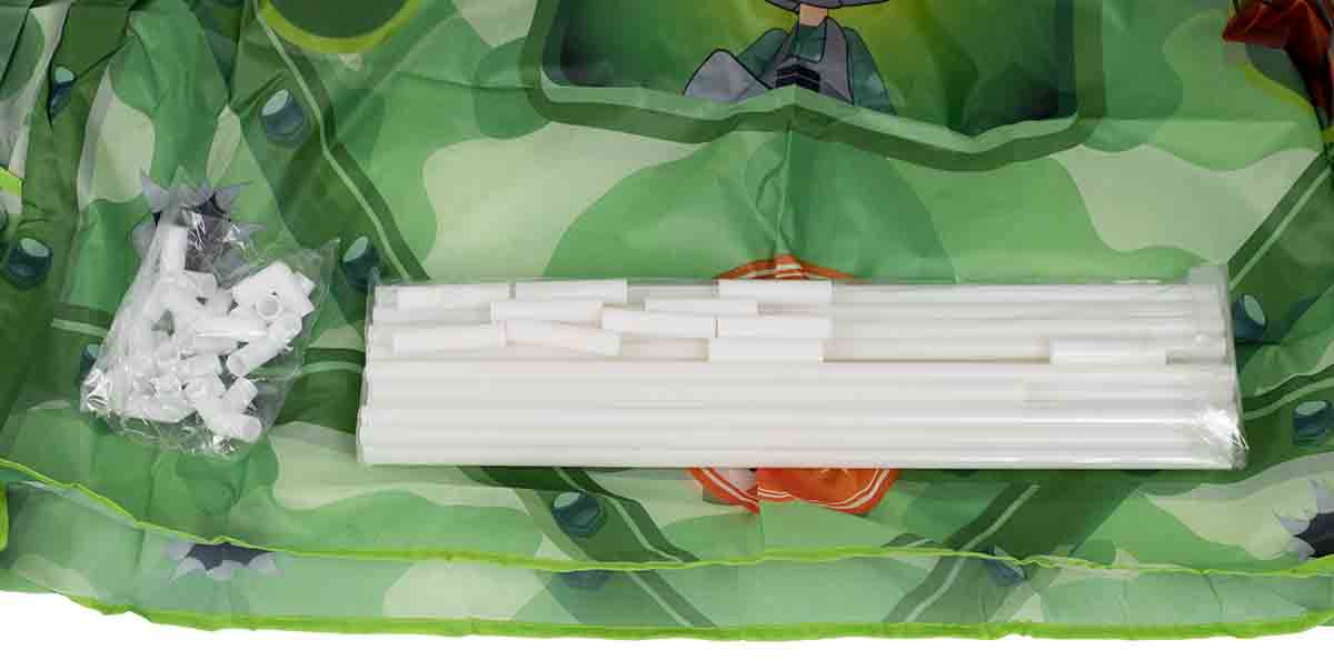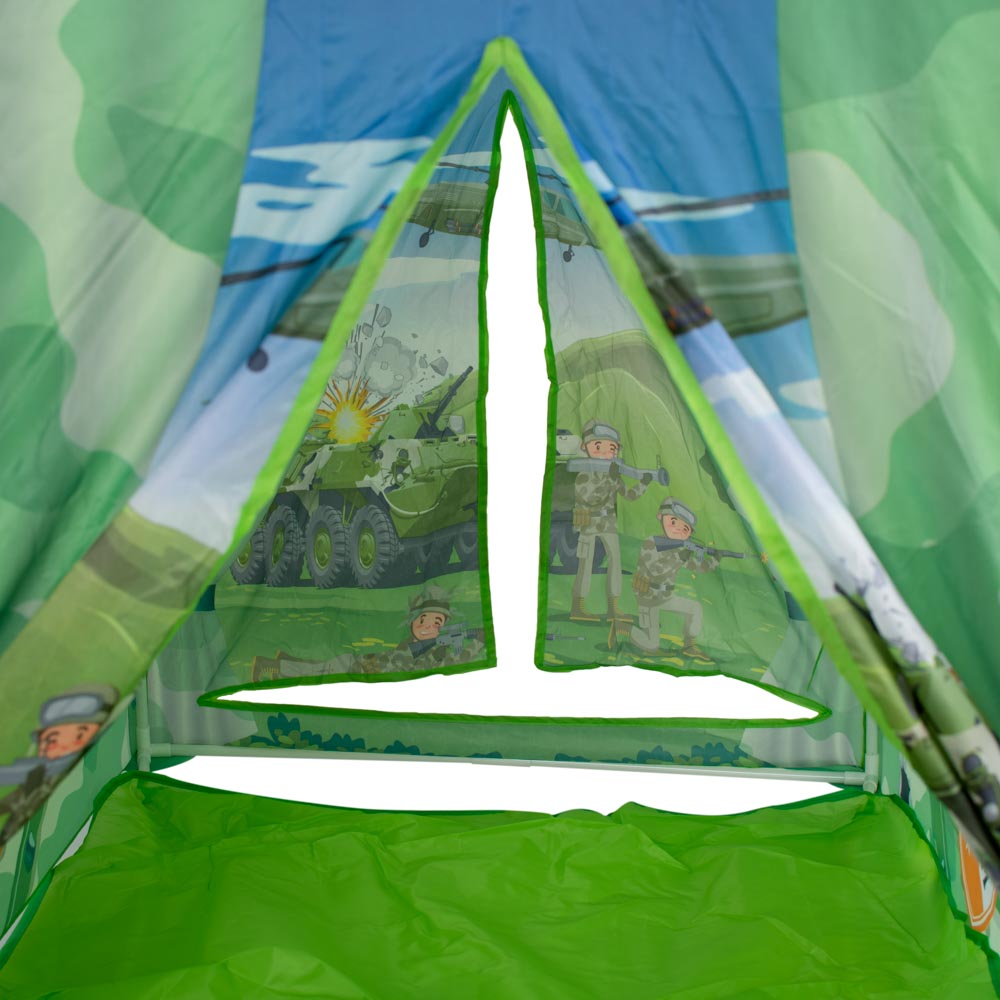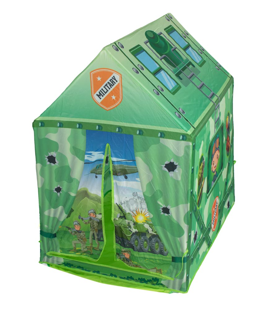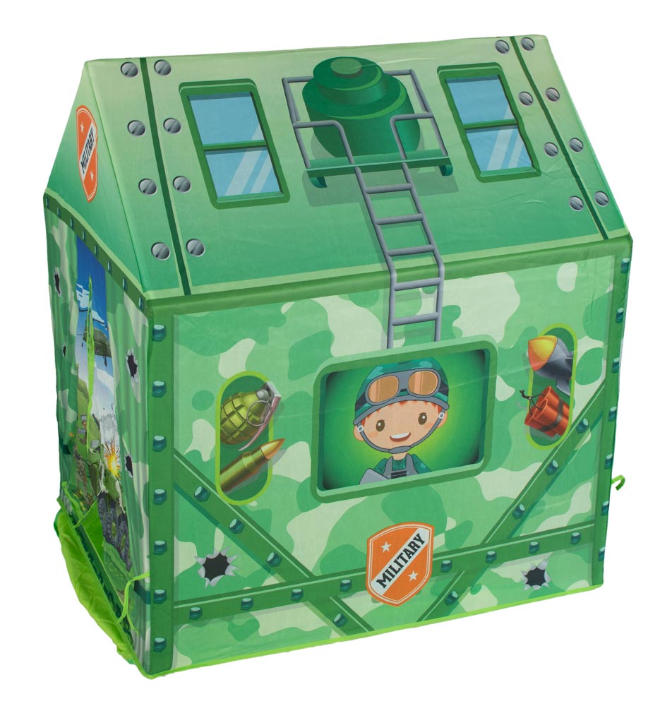 Dziecięcy domek wykonany z wodoodpornego, trwałego materiału. Każda ściana i dach posiadają ozdoby nawiązujące do prawdziwego wojskowego namiotu. Dostępny w kolorze zielonym moro. Wymiary: wys. całkowita 103cm, ściany 70cm, szer. podstawy: 93x69cm
