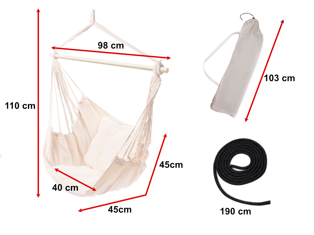 Hamak brazylijski i krzesło w jednym. Dodatkowe poduszki zapewniają niezapomniany relaks w domowym zaciszu i ogrodzie. Dzięki poprzecznemu drążkowi oraz grubo plecionym linom hamak jest stabilny i bezpieczny. Wymiary: 130x100cm. Dł. drążka: 100cm.