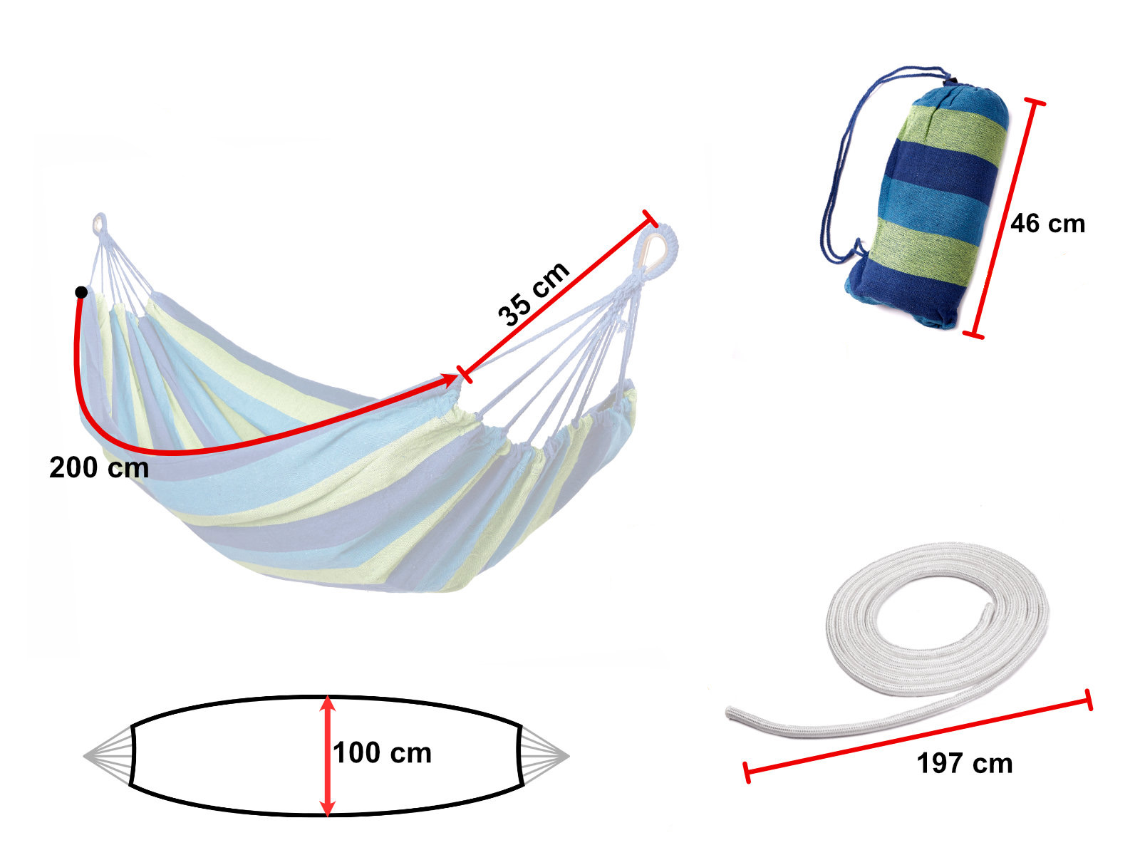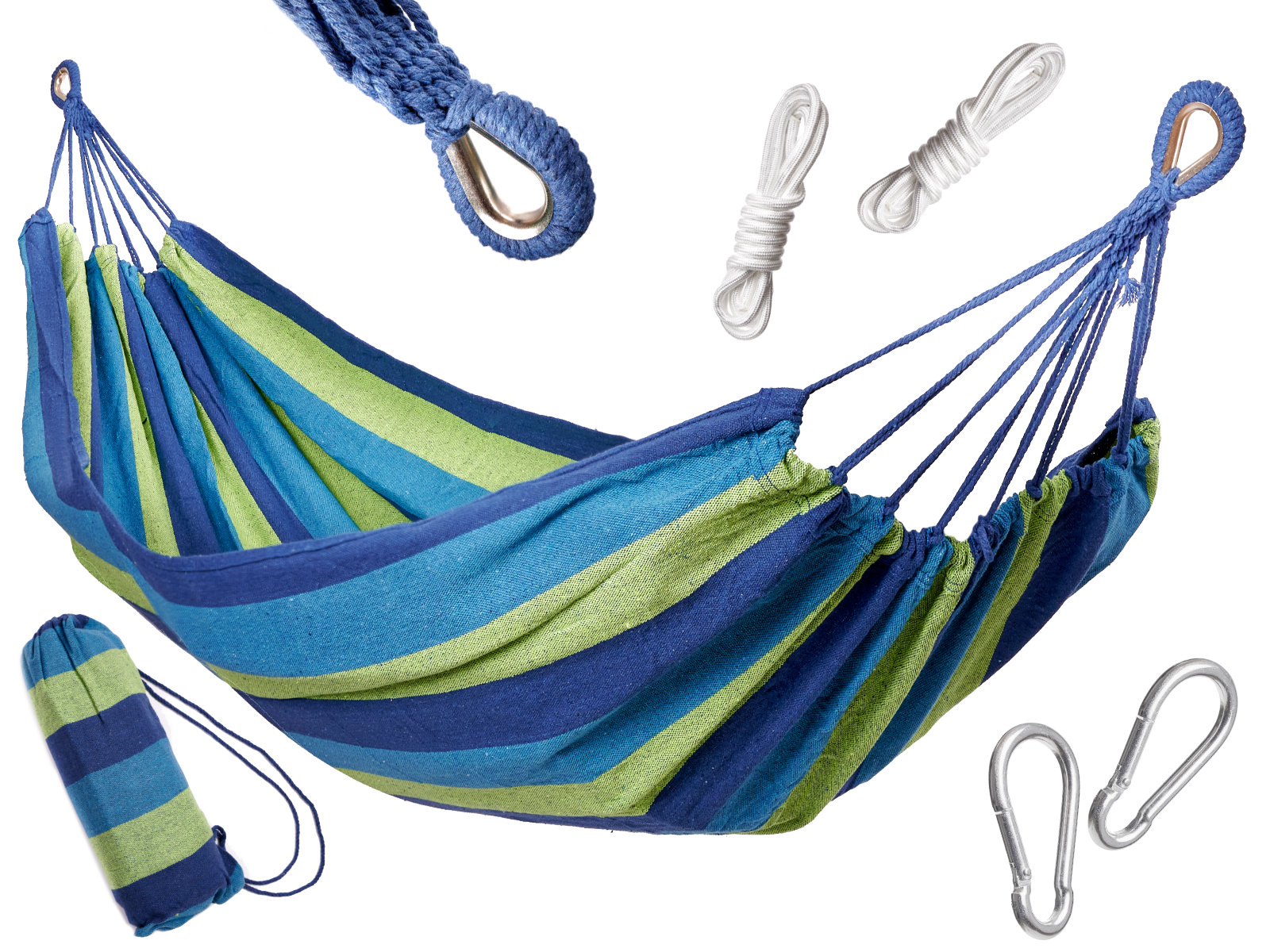 Jednoosobowy, pleciony hamak z zestawem montażowym. Posiada mocne liny i pętle wzmocnione metalowymi wstawkami. W zestawie: hamak, 2 liny, 2 karabińczyki. Zapakowany w worek. Maksymalne obciążenie: do 200kg. Kolor: niebiesko-zielony. Wym.: 200x100cm.