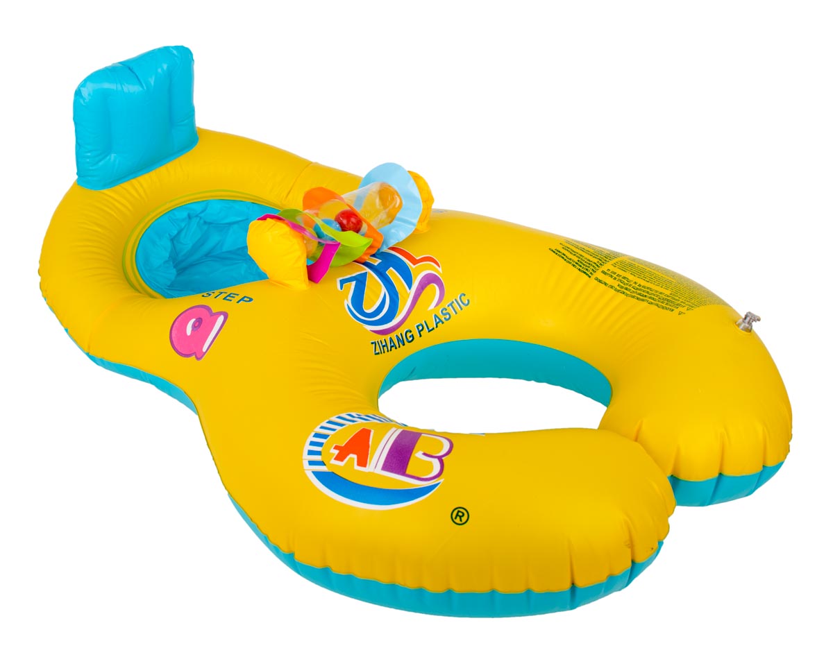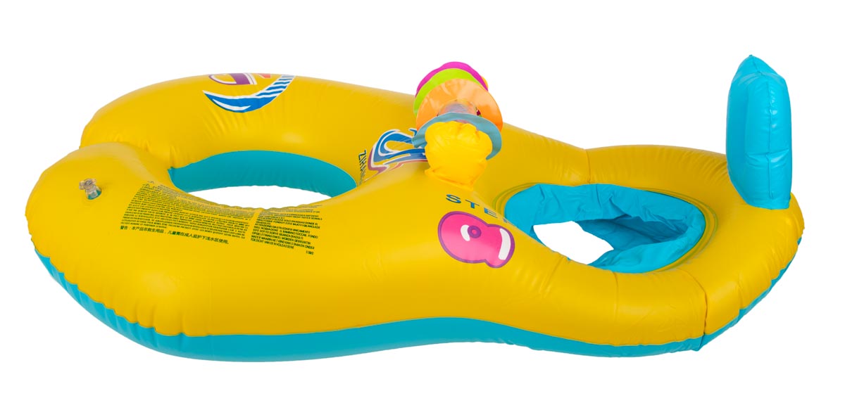 Dmuchany ponton wyposażony w bezpieczne oparcie oraz dwie komory na nóżki dziecka. Kolorowa zabawka przyciągnie uwagę malucha. Ponton posiada dodatkowe miejsce dla rodzica. Wykonany z plastiku PCV. Dostępny w kolorze żółtym. Wymiary: 83x60cm.