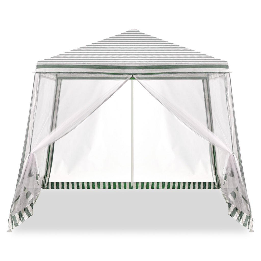 Duży pawilon ogrodowy z moskitierą. Idealny na wszelkie imprezy plenerowe. Chroni przed słońcem, niewielkim deszczem i komarami. Tworzywo: metal, plastik, PE. Wym. podstawy: 3×3 m. Wym. dachu: 2,4×2,4 m.