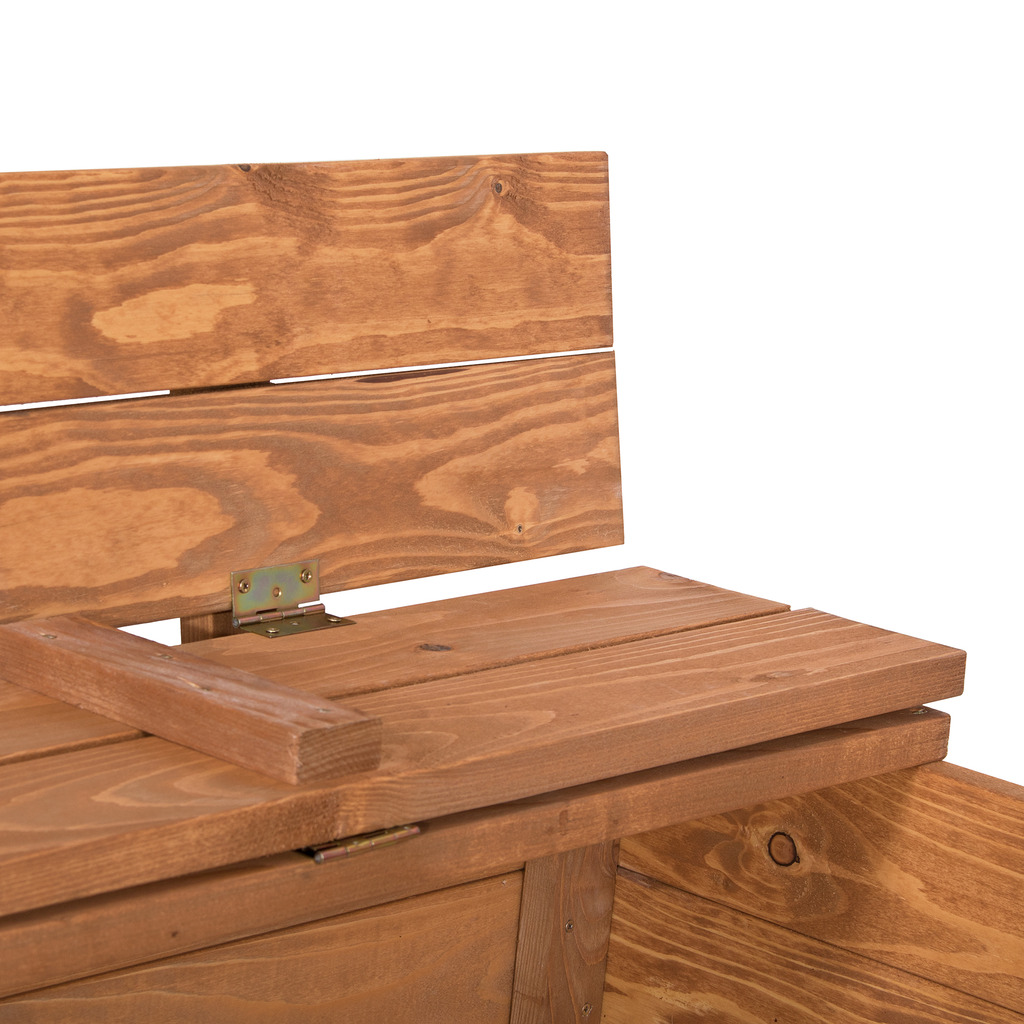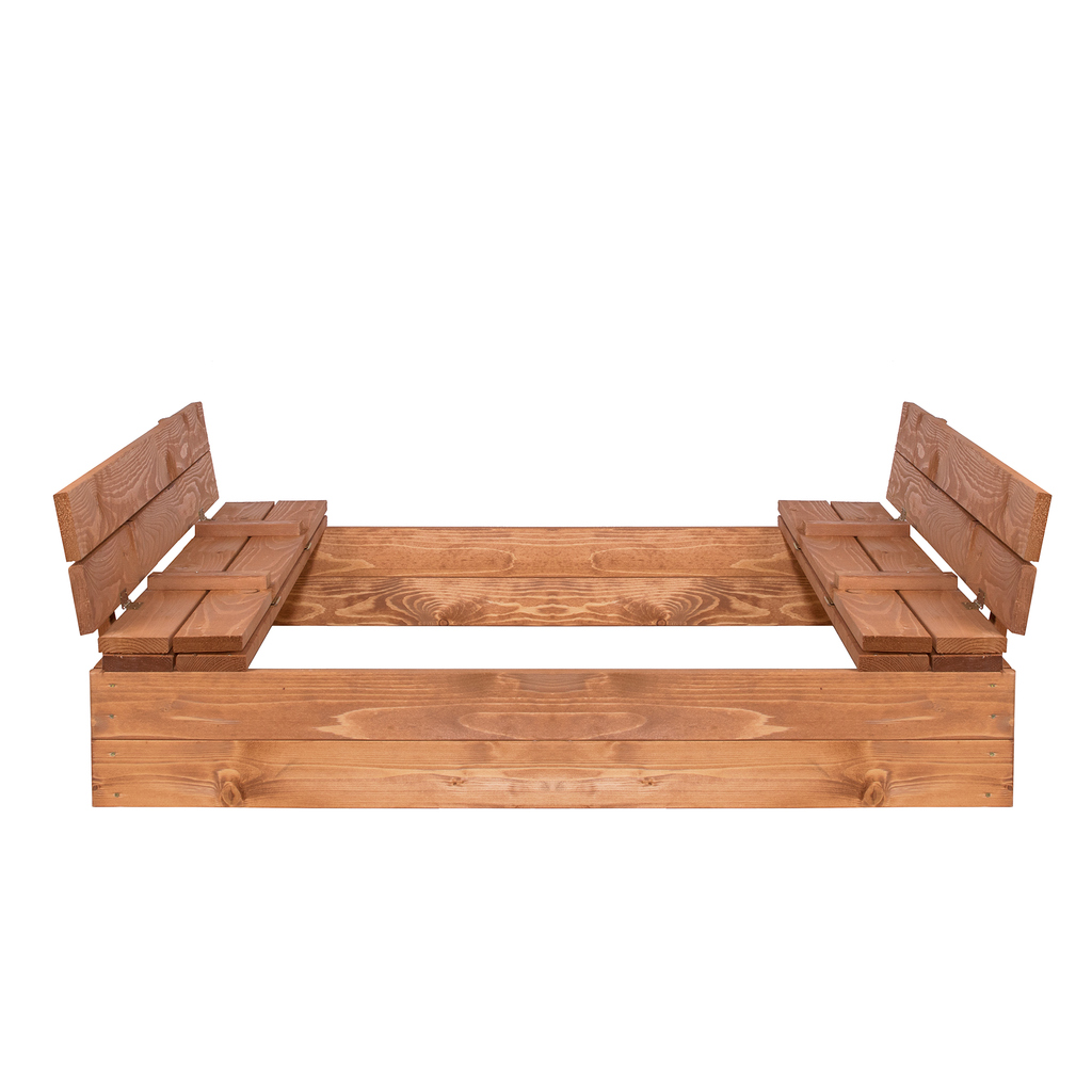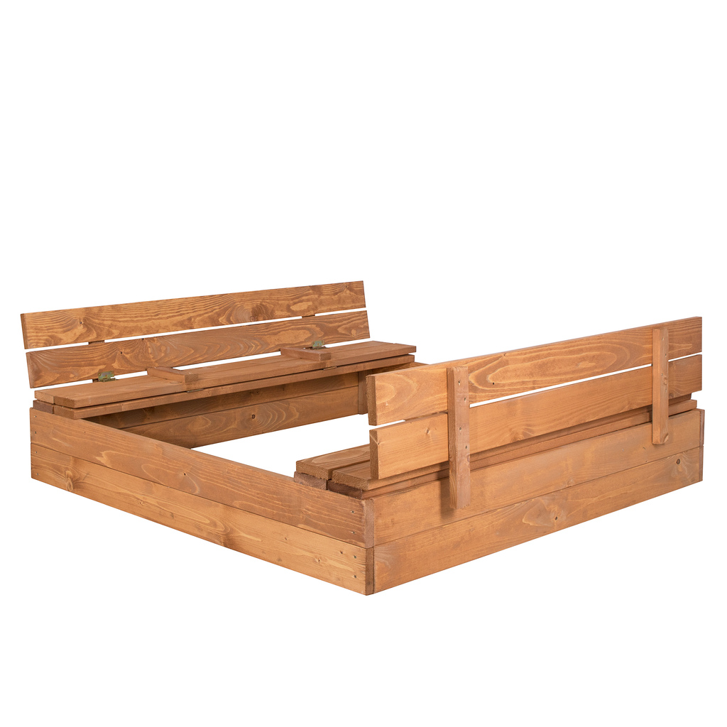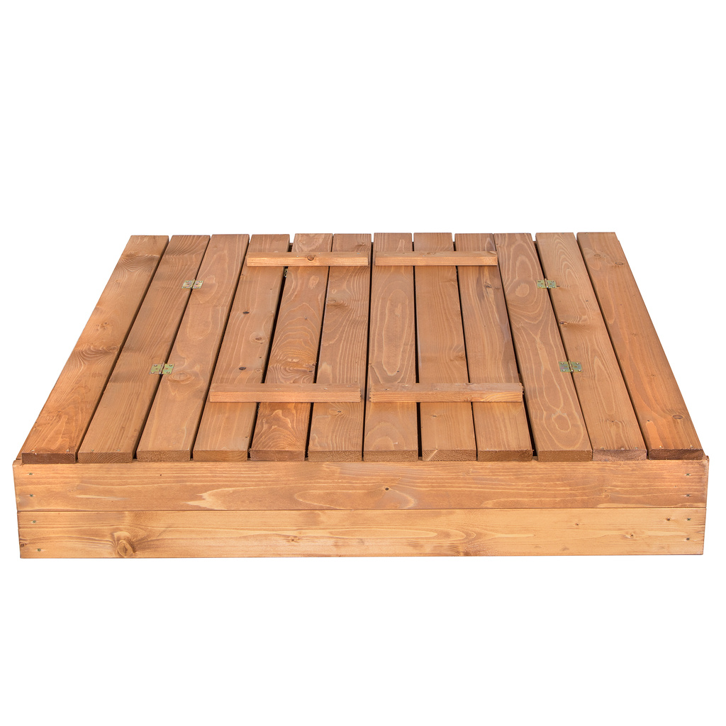 Drewniana piaskownica to obowiązkowy element każdego podwórka. Jest pokryta impregnatem chroniącym drewnianą konstrukcję. Boczne ławki przekształcają się w pokrywę, dzięki czemu piasek będzie chroniony przed zanieczyszczeniami. Wymiary: 150x150cm.