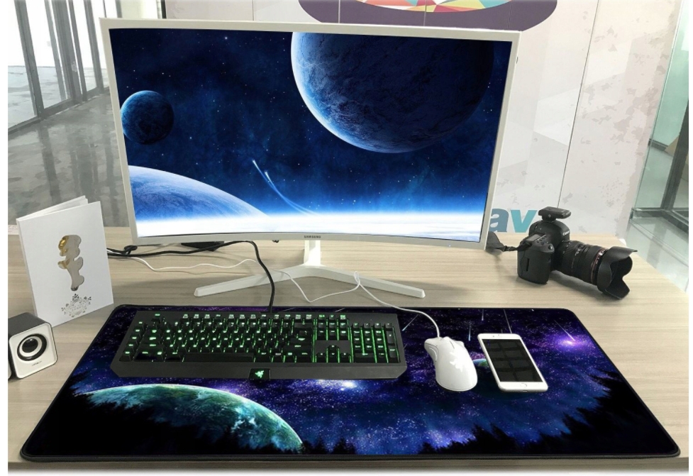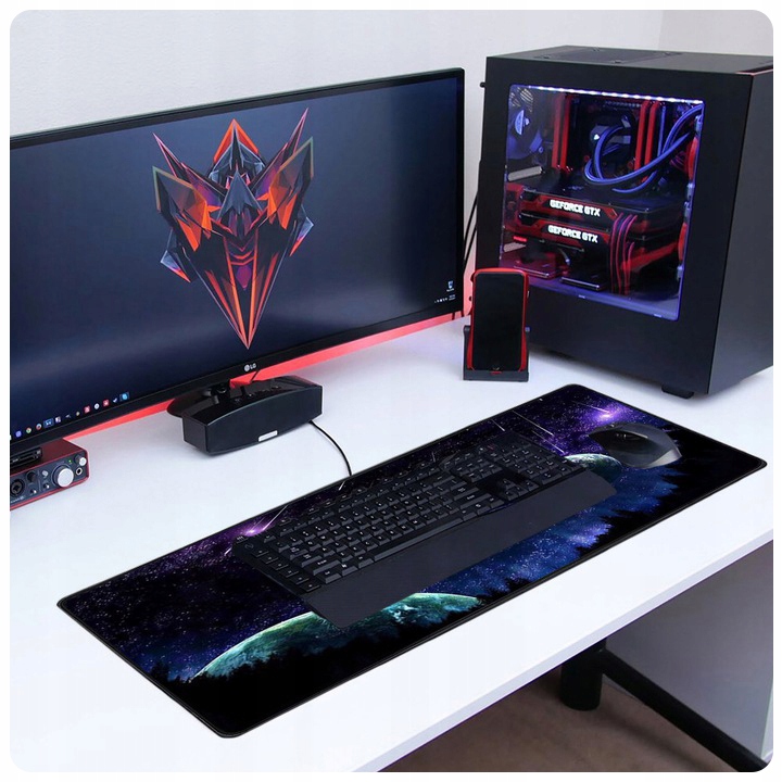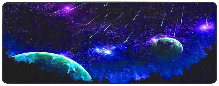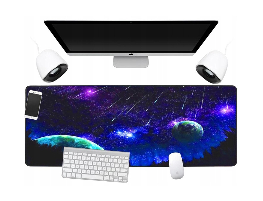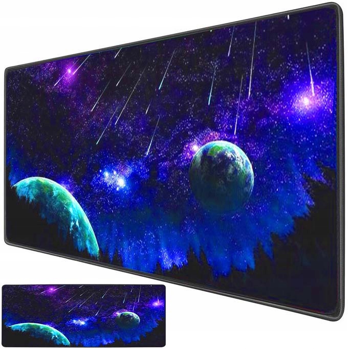 Duża, fantastyczna, gamingowa podkładka na biurko z nadrukiem kosmosu. Wykonana z wodoodpornego materiału, który zabezpieczy powierzchnię biurka oraz nie wpłynie na precyzję pracy myszy optycznych. Posiada antypoślizgowy spód. Wymiary: 90x40cm.
