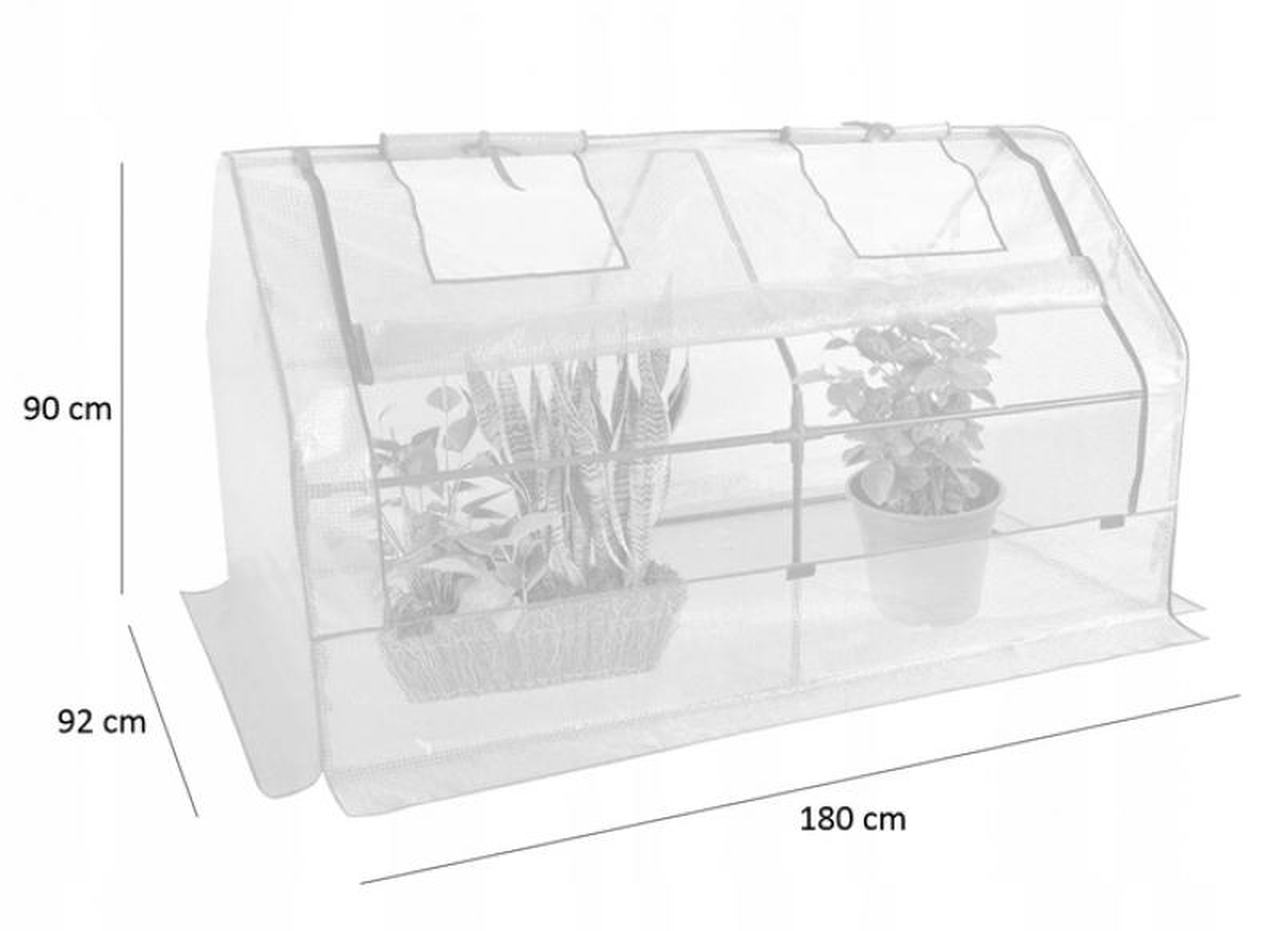 Szklarnia ogrodowa o wymiarach 180x92x90 cm. Posiada zwijane okna. Możliwość zwinięcia przedniej część ułatwia dostęp do roślin. Wykonana z folii o gramaturze 140 g/m2.